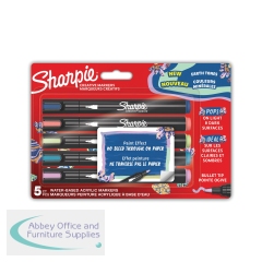 Sharpie Marker Paint Pens Assorted (Pack of 5) 2201069. Water-based acrylic markers. No need to shake. Colours layer with ease for added dimension. Suitable for use on: Paper, wood, ceramic, glass, rock and canvas. Bullet tip for fine lines.