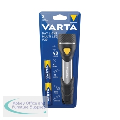 Varta Day Light Multi LED F20 Torch with 9 LEDS 62 Hours Run Time 16632101421. Shock-resistant three-component casing (aluminium, rubber, ABS plastic). With lanyard. Requires 2 x AA batteries (incl). 40 Lumens. 29m Range. 62 hours run time.