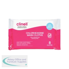 Clinell Chlorhexidine Wash Cloths (Pack of 8) CHGWC8. Cleaning and disinfecting wipes for skin. Simply wipe the relevant area with the cloth. Dispose of wash cloth in appropriate waste container. Size: 60cm.