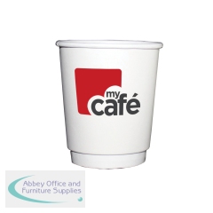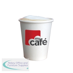 MyCafe 8oz Single Wall Hot Cups (Pack of 50) HVSWPA08V. Cups designed for carrying hot drinks and soups. Feature a bright, bold design. Capacity: 8oz. Supplied in a pack of 50.