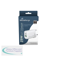 MediaRange GaN Fast Charging Adapter UK Plug 1xUSB-C and 1xUSB-A 25W White MRMA112-UK. Supports USB Type-C Power Delivery 3.0, Quick Charge 3.0 and PPS. Overvoltage protection, overcharge protection, short-circuit protection and overheating protection.