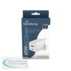 MediaRange GaN Fast Charging Adapter UK Plug 1xUSB-C and 1xUSB-A 45W White MRMA113-UK. Supports USB Type-C Power Delivery 3.0, Quick Charge 3.0 and PPS. Overvoltage protection, overcharge protection, short-circuit protection and overheating protection.