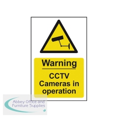 Spectrum Industrial Warning CCTV Cameras in Op S/A PVC Sign 200x300mm 1311. Features universally recognisable symbol for CCTV. Encourages safer practices in the workplace. Made with high-quality S/A PVC. Colour: Yellow and Black. Size: 200 x 300mm.