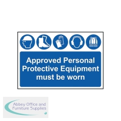 Spectrum Safety Sign Approved Personal Protective Equipment Must Be Worn PVC 600x400mm 4020. Use to highlight areas in and around a facility that the relevant PPE must be worn. Conforms to BS EN ISO 7010 regulation. Self-adhesive semi-rigid PVC.