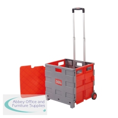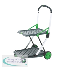 Clever Trolley with Folding Box. Lightweight folding trolley that can be collapsed easily with one hand operation. Supplied complete with one folding box which clips onto the top platform. Load Capacity - 20kg. Overall size - W470xD110xH670mm.
