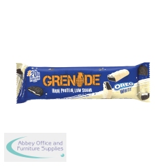 Grenade High Protein Bar Low Sugar White Oreo (Pack of 12) C007795. Creme layer flavoured with Oreo vanilla and a nougat centre with Oreo cocoa. Coated in an extra indulgent layer of white chocolate. 21g protein and 1g sugar. Topped with Oreo pieces.