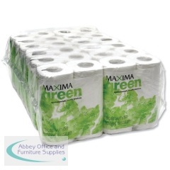 Maxima 320 sheet toilet roll. Two ply soft and strong white toilet rolls made from 100% recycled paper. In bulk packs of 36.