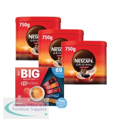 Nescafe Original Coffee Granules 750g 12283921. A carefully balanced blend of Arabica and Robusta beans. Freeze-dried to maintain maximum flavour. New tin shape. New hinged lid uses Click-to-Close technology. Provides approx. 420 cups of coffee. 750g tin.