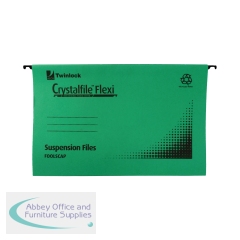 Crystalfile Flexifile. Brightly coloured manilla suspension files ideal for use in colour coded filing systems. Features a wrap-over bar design flexitabs and inserts which are snap proof and easy to fit. Size - Foolscap. Capacity - 15mm. Green.