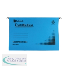 Crystalfile Flexifile. Brightly coloured manilla suspension files ideal for use in colour coded filing systems. Features a wrap-over bar design flexitabs and inserts which are snap proof and easy to fit. Size - Foolscap. Capacity - 15mm. Blue.