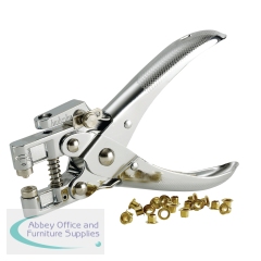 Rexel Eyeletter and Punch Chrome 20220049. Punches up to 13mm and attaches copper eyelets. Applies eyelets up to 4.7mm in diameter. Adjustable hole positioning guide. Hardened punching pin. Ergonomically designed handle for comfortable use.