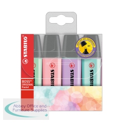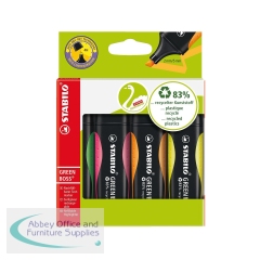 Stabilo Green Boss Highlighter Assorted Pastel (Pack of 4) 1523155. Made using 83% recycled plastic, Perfect for the environmentally conscious. Pastel colours are easy to read through on notes, print-outs and photocopies. Line Width: 2 5mm.