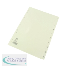 Set of 10 A4 dividers numerically tabbed (1-10). Ideal for well-organised filing. Punched to fit most standard A4 files. Mylar-reinforced tabs and holes for durability. Index page: at-a-glance view of sections. Colour: White with matching white tabs.