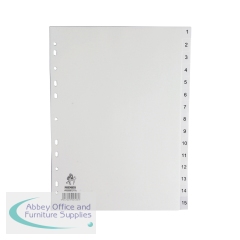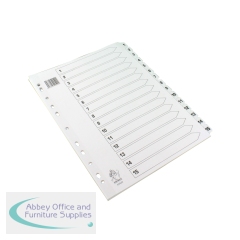 Set of 15 A4 dividers numerically tabbed (1-15). Ideal for well-organised filing. Punched to fit most standard A4 files. Mylar-reinforced tabs and holes for durability. Index page: at-a-glance view of sections. Colour: White with matching white tabs.