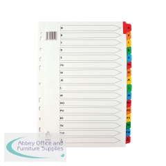 Set of 16 A4 dividers alphabetically marked (A-Z). Ideal for alphabetical filing. Punched to fit most standard A4 files. Mylar-reinforced tabs and holes for durability. Index page: at-a-glance view of sections. Colour: White with multi-coloured tabs.
