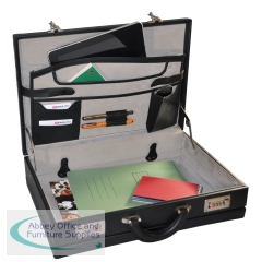 Monolith Expanding Attache Case. Expandable case manufactured from PVC with flock lining and gilt combination locks and fittings. Other features include full lid organiser section and raised stitch design to the top. Size: W440xD100x310mm. Black.