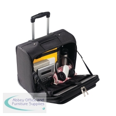 Data/Catalogue wheelie pilot case with fixed base wheels and retractable handle. Front and side pockets. Combination locks. Black. 480x360x230mm.