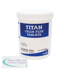 Titan Chlor + Chlorine Tabs Tub of 200 7518698. Disinfects and sanitises surfaces and utensils. dissolves 1 tab in 5 litres of water for 100ppm available chlorine. Conforms to EN13704 EN1650 and EN1276. Handy resealable tub.