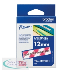 Brother TZe Labelling Tape 12mm x 4m Black on Red Gingham TZEMPRG31. Use with Brother P-touch label printers. Laminated. A stylish touch of creativity. For use in extreme temperatures, resistant to chemicals, abrasion, sunlight and in water.