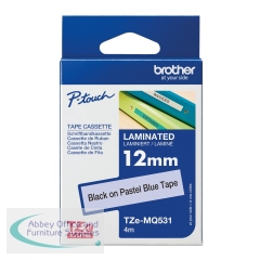 Brother TZe P-Touch Labelling Tape 12mm Black on Pastel Blue TZEMQ531. Use with Brother P-touch label printers. Laminated. For use in the home or workplace. For use in extreme temperatures, resistant to chemicals, abrasion, sunlight and water. Length: 8m.