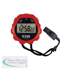 Acctim Sprint Stopwatch Red TIM901R. Split timing (1/100th second). Water resistant. With an alarm feature. Whistle attached. With a lanyard. Requires 1x CR2032 Coin Cell (included).