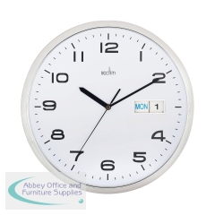 Wall clock with day and date display. Chrome trim with black numbered dial. Domes glass lens. Precision quartz clock movement. Face diameter: 320mm. Requires 1xAA battery (not included). Colour: Chrome/White.