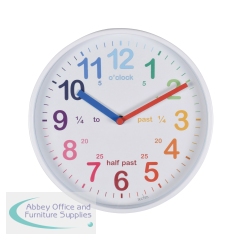 Acctim Wickford Time Teaching Clock White 22522. Time teaching clock. Quartz movement. Multi-coloured numbers. Blue and red hands. Colour: White.