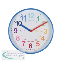 Acctim Wickford Time Teaching Clock Blue Edging 22529. Time teaching clock. Quartz movement. Multi-coloured numbers. Blue and red hands. Colour: White/Blue.