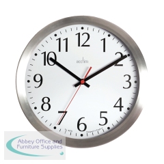 Acctim Javik 10 Inch Wall Clock Aluminium 27417. Silent sweep second hand no ticking. Large easy read dial. Plastic case and glass lens. Diameter - 355mm. Finish: Steel and White. Requires 1 x AA battery not included.
