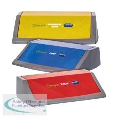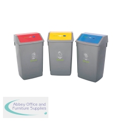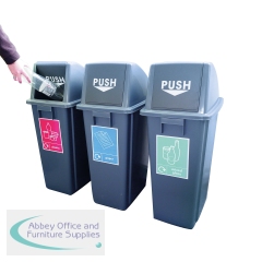 Addis recycling bins. Each bin has a colour coded lid and label to identify the contents to be recycled. Use to sort paper plastics and aluminium cans. 60 litre capacity. Pack of 3.