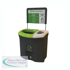 Meridian Recycling Bin Double Mixed Recycling General Waste 87L Black/Lime/White 81893/6. Black base, lime green open left lid mixed recycling label, white open right lid general waste label. WxDxH: 600x400x652mm. Total Height: 1140mm.