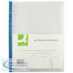 Q-Connect Deluxe Punched Pockets. Embossed anti-glare finish 75 micron high quality multipunched pockets suitable for most binders. Features reinforced Blue strip edge and top opening. Size: A4.