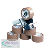 6 rolls of 50mmx66m Brown economy polypropylene tape supplied with a braked metal pistol grip dispenser.