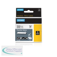 Industrial labelling tape. Designed for Rhino label makers. Made from flexible nylon for round and curved surfaces. Industrial-strength adhesive. Compatible with Rhino 4200, 5200 and 6000. Prints black text on white. Width: 12mm. Supplied on 3.5m roll.