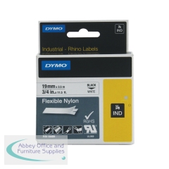 Industrial labelling tape. Designed for Rhino label makers. Made from flexible nylon for round and curved surfaces. Industrial-strength adhesive. Compatible with Rhino 4200, 5200 and 6000. Prints black text on white. Width: 19mm. Supplied on 3.5m roll.