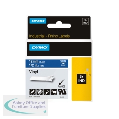 Industrial vinyl labelling tape. Designed for RHINO label makers. Made from strong vinyl. Industrial-strength adhesive. Easy peel. Compatible with RHINO 4200, 5200 and 6000. Prints black on white. Width: 12mm on a 5.5m roll.