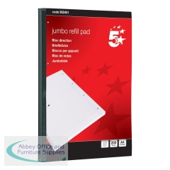 5 Star Office Jumbo Refill Pad Sidebound 60gsm Ruled Margin Punched 4 Holes 400pp A4 Red (Pack of 4). Ruled pages with a margin for neatness. Pre-punched with 4 holes. 60gsm white paper. Card cover notebook for flexibility. Cover Sidebound refill pad.