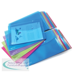 Durable transparent polypropylene popper wallet with Superline finish. Hold up to 150 sheets (80gsm). Fold-over flap with colour coordinated press-stud closure. Size: foolscap. Colour: Bright Assorted. Pack of 20.
