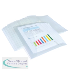 Durable transparent polypropylene popper wallet with Superline finish. Hold up to 150 sheets (80gsm). Fold-over flap with colour coordinated press-stud closure. Handy integrated pen holder. Size: foolscap. Colour: Clear with white popper. Pack of 20.