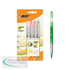 Bic Highlighter Grip Assorted Pastel. Flurorescent water based ink in a vibrant barrel with a comfortable rubber grip. Light colours are ideal for faxes and photocopies. Chisel tip for variable line width. Pack of 4.
