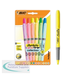 Bic Highlighter Grip Pastel Assorted (Pack of 12) 992562. Assorted standard and pastel colours for variety. Grip for comfortable handling. Secure cap design with 8 hour cap off time. Chisel tip for 1.6 to 3.3mm line width.