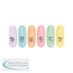 Q-Connect Fun Mini Highlighter Pens Pastel Assorted (Pack of 6) KF17419. Pastel highlighters with clip. Suitable for most types of paper without fading. GRS certified: 50% recycled plastic. Joyful faces printed on the barrel.
