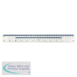 Transparent desktop ruler. Durable acrylic construction. Bevelled edge for easier drawing. Millimetre and inch scales. Length: 300 mm. Pack of 20 rulers.