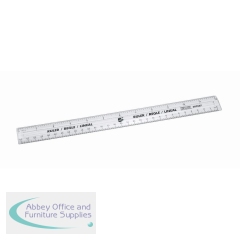 Transparent desktop ruler. Durable acrylic construction. Bevelled edge for easier drawing. Millimetre and inch scales. Length: 300 mm. Pack of 20 rulers.
