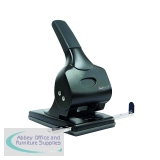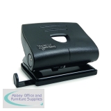Heavy duty two hole punch with all metal workings. Metal base with rubberised confetti tray and handle lock down for easy storage. Integral paper guide for accuracy. 35 sheet capacity. Black.