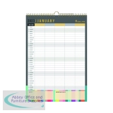 Collins Edge Wall Calendar Month To View A3 2026 EDFC135.26. Month per page with writing space for each day. Spaces for 5 people to use. International holidays noted. Wirebound at the top with a hook for wall hanging.