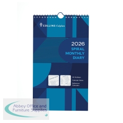 Collins Month To View Wirebound Diary 2026 6426. Month to view notepad diary. Writing space for each day. Wirebound at the top with loop for easy wall hanging. Printed soft back cover. Dimensions: 305 x 178mm.