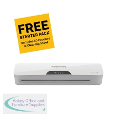 Fellowes Saturn A3 Laminator 5736101. Laminates at 30cm/minute. Laminates up to 125 micron pouches. Heats up in 60 seconds with InstaHeat Technology. Feed sensor indicates when document has been misfed. Includes a starter kit for 10 documents.