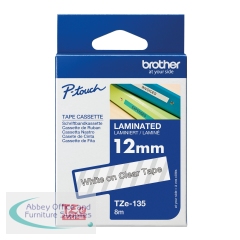 Brother TZe-135 P-Touch Labelling Tape 12mm x 8m White on Clear TZE135. Tape cassette for a range of Brother\'s P-touch label printers. Laminated to protect from extreme temperatures, abrasion, water, chemical damage. Indoor and outdoor use. Adhesive back.