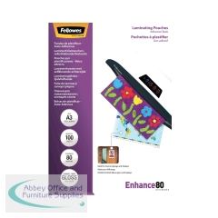 Fellowes A3 Laminating Pouch Adhesive Back 80 Micron Clear High Gloss (Pack of 100) 5302302. Fellowes laminating pouches compatible with all laminator brands. Ideal for notices, craft materials, signage and frequently handled documents.